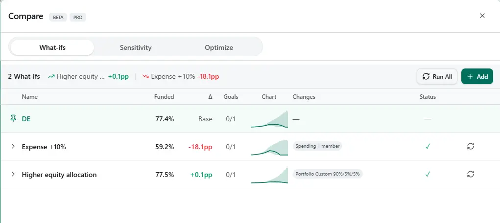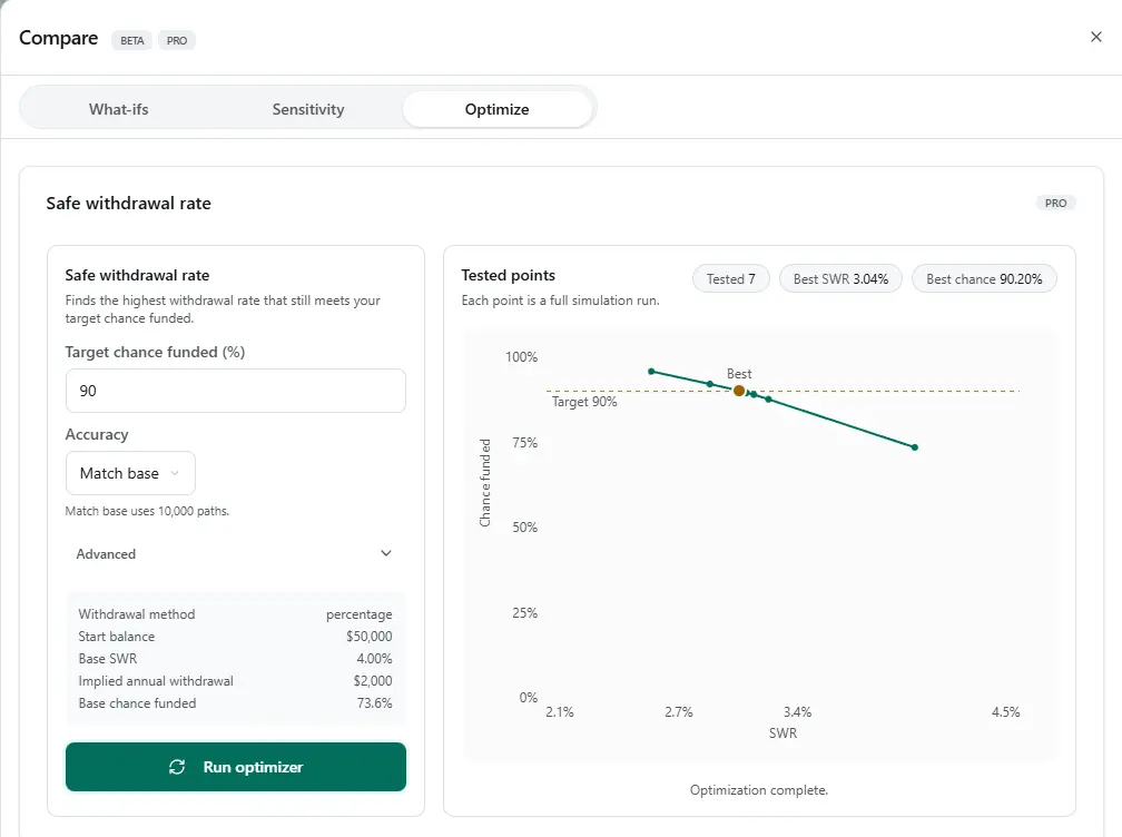 2. What-ifs, sensitivity, and safe withdrawal optimizers (Pro, Beta)