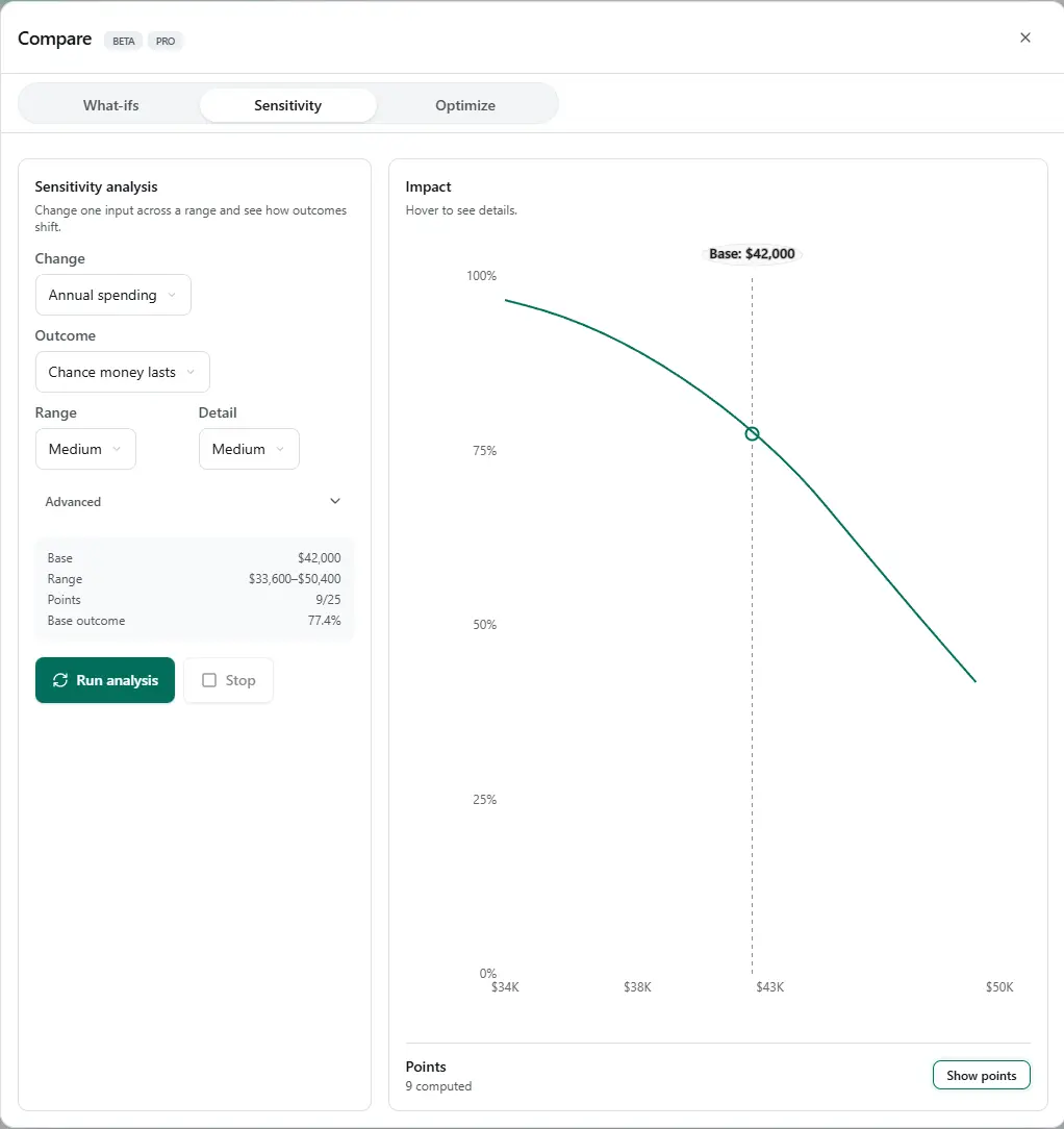 Note: These tools are available in ActuaPlan Pro plan. They run a lot more simulations than a standard plan run, so we keep them part of Pro to support the compute cost and continued development. For now, we’re making them available on Free for a short period to gather feedback.